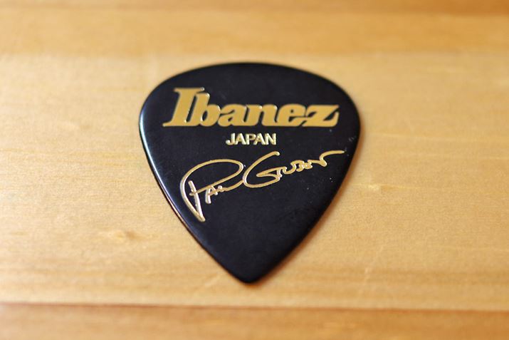 私が愛用するIbanezの「PAUL GILBERT PICK(ブラック)」。色はどうでもいいんじゃないかと思われるかもしれませんが、塗料の関係なのか、アタックしたときの感覚が若干異なります(少なからず私にはそう感じられます)。このピックは比較的入手しやすいのですが、ブラックは意外と手に入りにくいので、私はまとめ買いしてストックしています