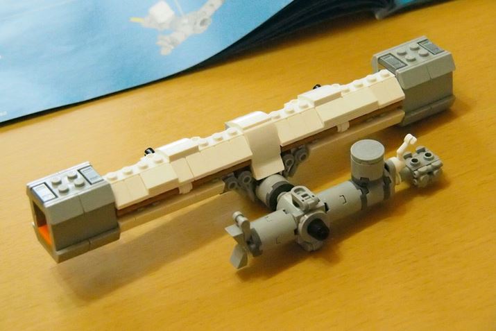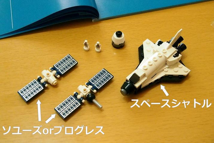 最初のステップ1ではISSに飛来する宇宙船を組み立てます。スケールやブロックの都合でロシアのソユーズ宇宙船は簡略化されていますが、アメリカのスペースシャトルはなかなかそれっぽく仕上がるところが楽しいです。