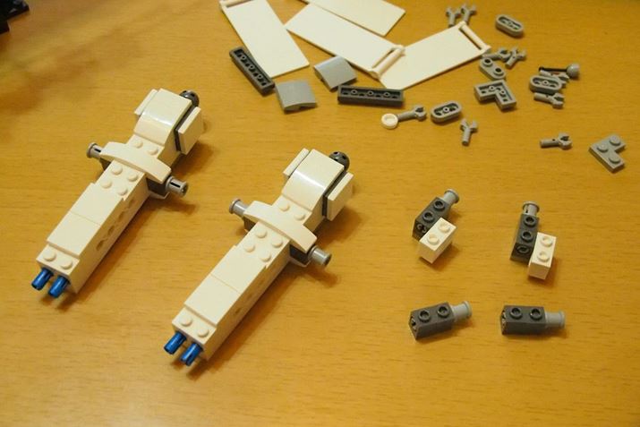 ステップ1を終えたところ。スペースシャトル1機、ソユーズ宇宙船もしくはプログレス補給船が2機、ドラゴン補給船の再突入カプセルらしきもの1機が組み上がりました。組立不要の小さな宇宙飛行士も2人付属します