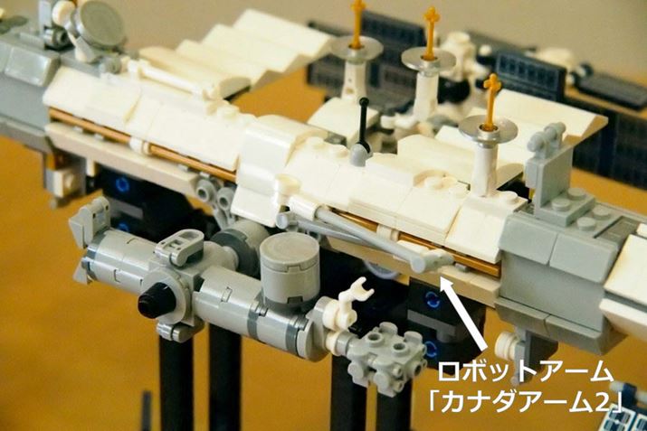 トラスの中央部分をクローズアップ。トラスに取り付けられている観測機器やアンテナなども再現されています。日本実験棟の上に見えるロボットアームも角度を変えることが可能です