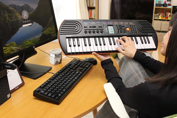 また、小さいお子さんのいる家であれば、大人と子どもが一緒に楽しめると思います。最初のうちは内蔵音源を鳴らしながら「弾くフリ」をするだけでも楽しいはずですし、ドラムパッドを使ってリズム感を養うのもいいのでは? それに筆者宅のSA-76のように、フロントのディスプレイに簡易的な五線譜の表示機能がある機種なら、ちょっとした学びにもなるでしょう。また、サイズが小さくて軽いというメリットは、子どもが持ち運びやすいことにもつながっています。
