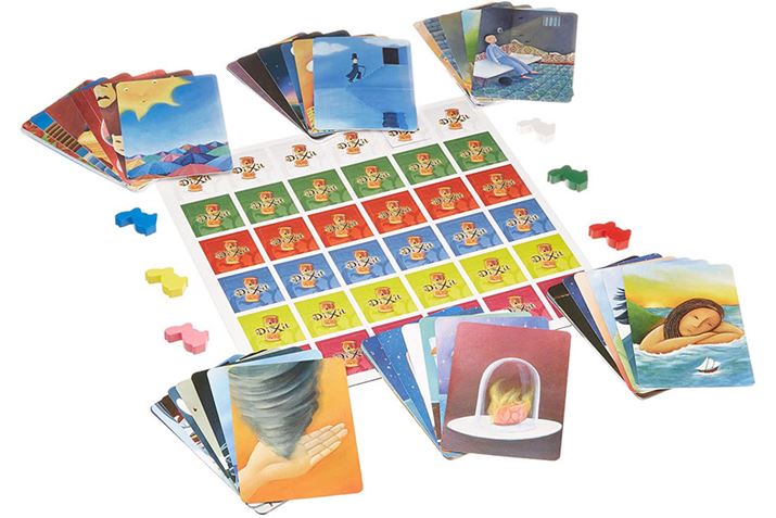 カードに描かれた抽象的なイラストを見て、思い浮かんだ言葉を他プレイヤーに伝えるゲーム。語り部(親)は、正解のカードを全員に当てられる、もしくは誰にも当てられないと失点となるため、数名にのみ伝わるお題を考えて出していく