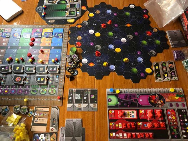 宮下さんが「テラミスティカ:ガイアプロジェクト 日本語版」をソロプレイしている時の写真。NPCを相手に戦う