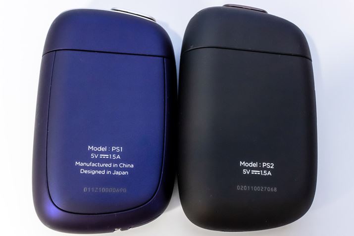 左が初代「プルーム・エス」で、右が「プルーム・エス・2.0」。裏返すと、モデル名が「PS1」から「PS2」に変わっている。また、裏ぶたのような、ボディを1周する切れ込みが消えている