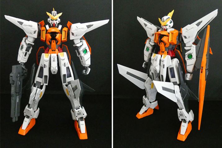 キュリオス完成形です。劇中同様のスマートなプロポーション。変形後に翼となるパーツなどに、かなりとがったものもあるので注意が必要です