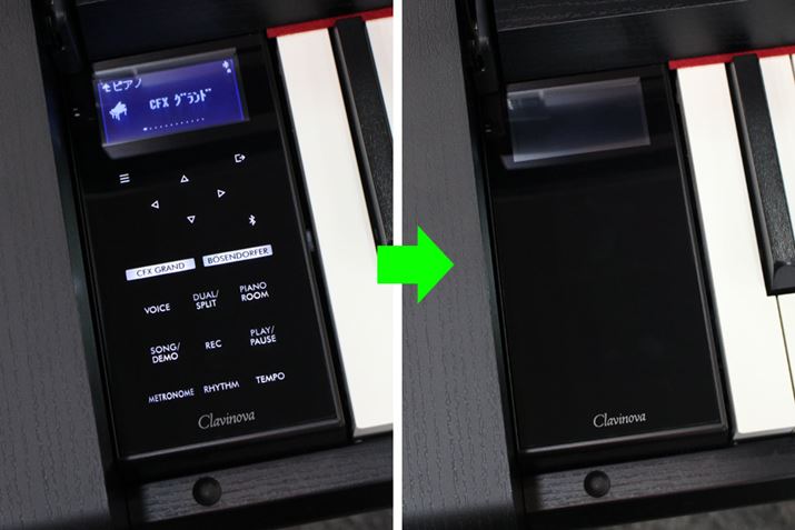 コントロールパネルが消灯すると、あたかもそこには最初から何もなかったかのようになって、演奏に集中できる。ちなみに下位モデル2機種は、従来の物理ボタンとディスプレイによるコントロールパネルを装備する