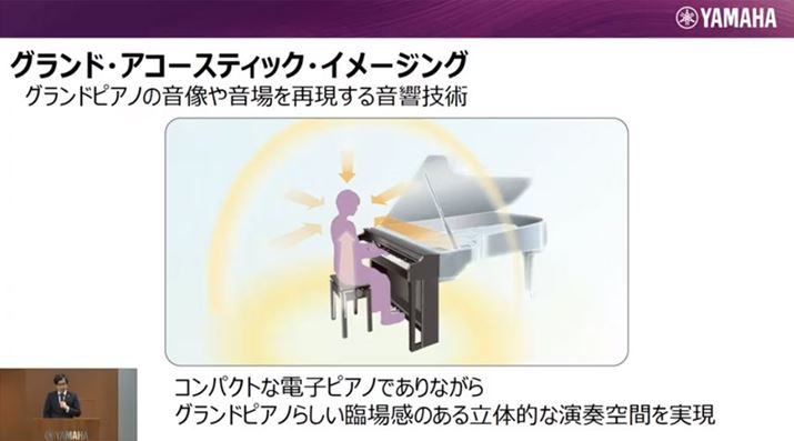 さらに上位モデルのCLP-785/ CLP-775には、グランドピアノらしい立体的な演奏空間を実現する音響技術「グランド・アコースティック・イメージング」が搭載されている。グランドピアノの演奏中に1つひとつの音がどういう位置でどのように鳴っているかを測定し、その情報を元に電子ピアノで再現したというもの。それぞれ3ウェイ構成のスピーカー部に加振器も追加搭載することで、あたかも響板から音が鳴っているかのような奥行感と音の広がり感も表現している。