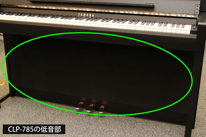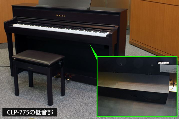 上位2モデルともスピーカーは3ウェイ構成で加振器をプラスしているが、本体のサイズが異なるため、スピーカーユニットはそれぞれ最適となるよう配置を変えている。特にわかりやすい違いは低音部で、最上位のCLP-785は、下前板部分から低音を鳴らす仕組みとなっており、CLP-775は下部にボックス型の低音ユニットを搭載する仕様