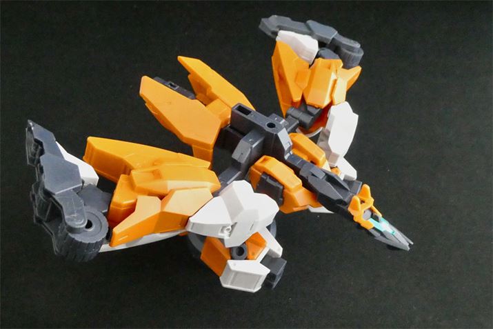 前説が長くなってしまいましたが、まずはベースとなる「コアガンダムII」から紹介していきます。HGなので、キットとしてはサクサクと組み立てられ、「コアガンダムII」だけなら30分前後で素組みができるのもうれしいところ。通常のガンプラと比べると小さく、一見不格好に見えるのですが、可動領域が広く、とても遊びやすいガンプラとなっています。
