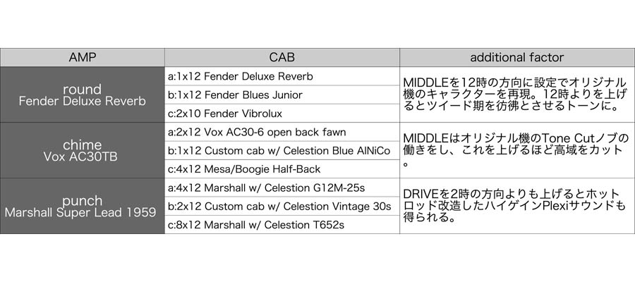 上記は、各アンプの基本キャラがわかりやすいGAIN12時と歪みの感じがわかりやすいGAIN3時のサンプル。フレーズはサンボマスター「朝」風→Extreme「Cupid's Dead」風。筆者の絶妙な下手さはさておき、こうやって聴き比べると、