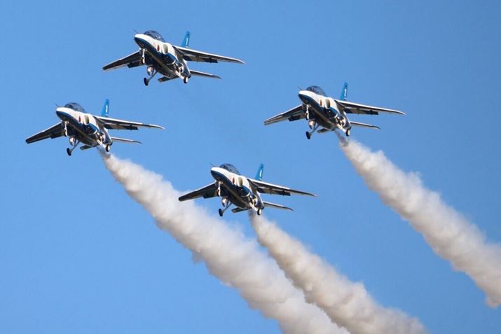 入間基地には戦闘機部隊は配備されていないが、ほぼ毎年、航空自衛隊のアクロバット飛行隊「ブルーインパルス」が展示飛行を行うため、とにかくブルーが見たい!という場合は入間の航空祭に行くのが手っ取り早いだろう。ブルーインパルスは今年5月に東京上空を6機編隊で展示飛行したことで注目を集めたが、航空祭ではもっと迫力のプログラムが見られる。空にスモークでハートを描き最後に矢で射貫く「バーティカルキューピッド」は有名だが、そのほかにも、2機が進入し正面にぶつかりそうな距離でギリギリすれ違う(しかも背面飛行で!)スリル感たっぷりのアクロバット飛行など、見応えありまくりである。
