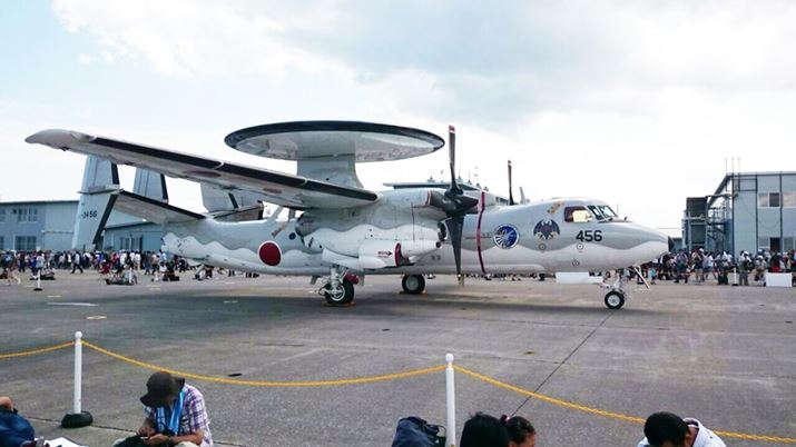 2015年三沢基地航空祭の「E-2C」。自衛官は一般人にこの機体を紹介する際、「最後はこの背中の大きな円盤を飛ばして攻撃します!」と鉄板ギャグ?を飛ばすらしい