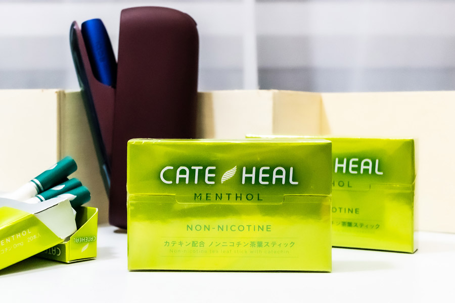 「カテヒール」は、茶カテキンを配合して特許を取得したノンニコチンスティック。よりヘルシー方向へ舵を切った製品だ。発売元は衛生用品から医療機器までOEM生産もこなす東亜産業。これも「ノンニコ」同様緑茶をベースとしている。