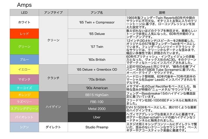 なので、アンプとエフェクトを以下の一覧表にまとめてみました!