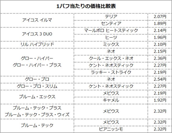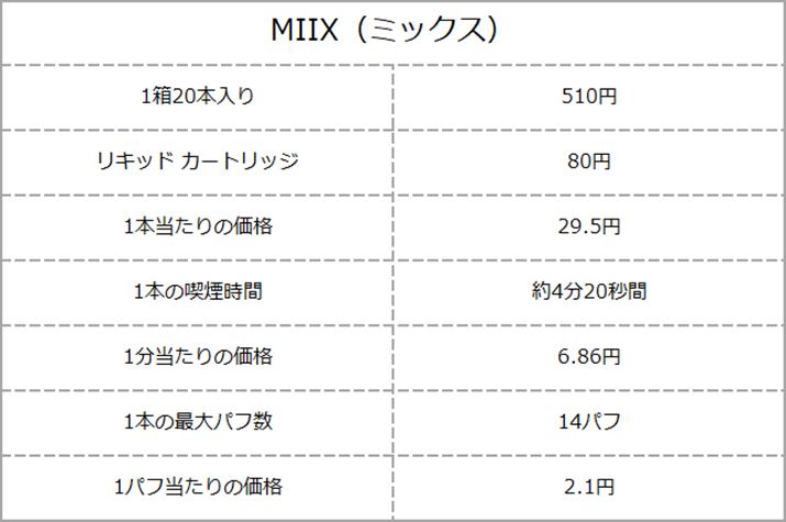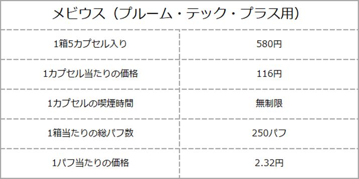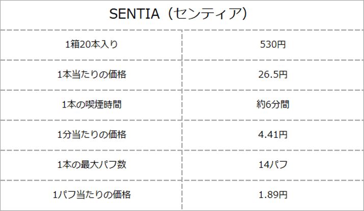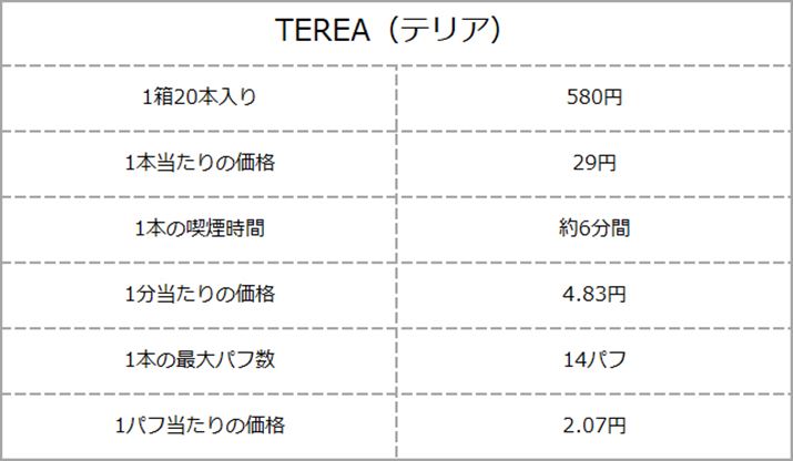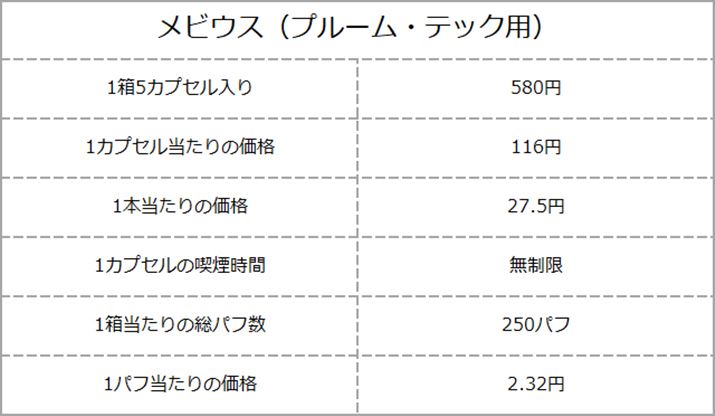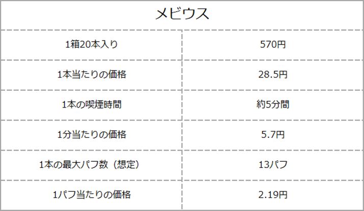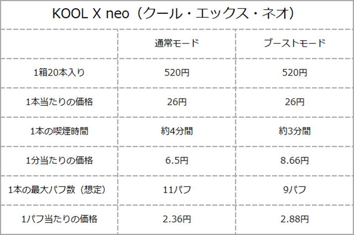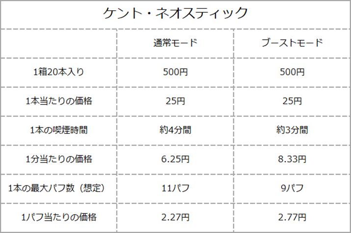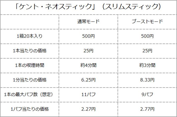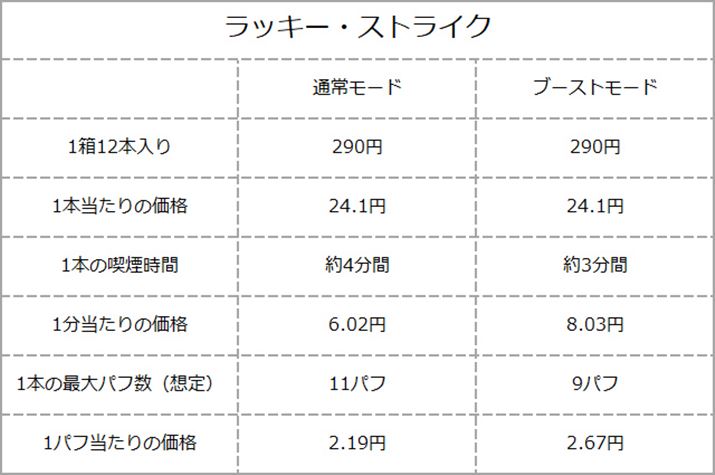1本当たり25円。喫煙時間は約4分間(ブーストでは3分間)なので、1分当たり6.25円(ブーストでは8.3円)。パフ数制限11回で考えれば、1パフ2.3円となる。メンソールタイプを味わうための細身タバコとしての完成度は高いが、コスパとしてはよろしくないようだ。