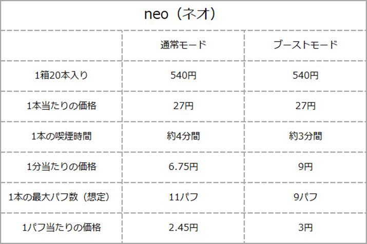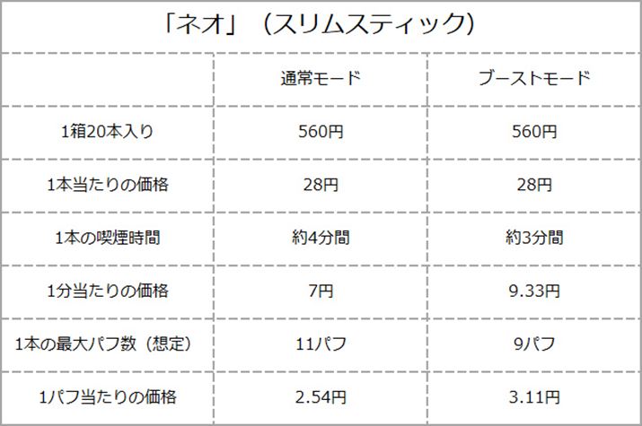 「ネオ」は、1本当たり27円。喫煙時間は、約4分間(「ブーストモード」では3分間)と比較的短めなので、1分当たりは6.8円と少し高め。パフ数制限はないが、時間が短い分、「アイコス」並みに14パフ吸うのは難しいだろう。筆者が使用する時の平均的な回数11パフで計算すると、1パフ2.45円。1箱540円という安さに惹かれるかもしれないが、実は1パフ当たりの価格は高めだ。