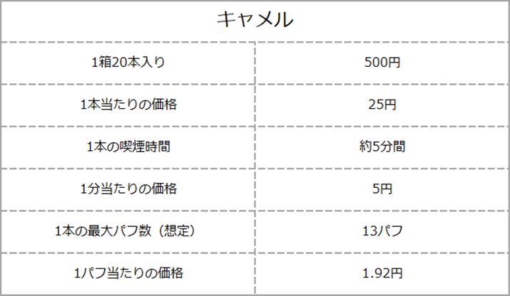 2021年10月に据え置きだったワンコイン価格がさらに継続。1本当たりの価格は25円。喫煙時間は約5分間なので、1分当たり5円。パフ数は無制限だが、13回で想定すると、1パフ1.9円となる。ワンコインで手に入るコスパのよさ、吸い応えは軽やかだが、香ばしくてウマいので、満足度もそこそこ高い。「キャメル」という人気ブランドがワンコインで吸えるというのも、お得感がある。