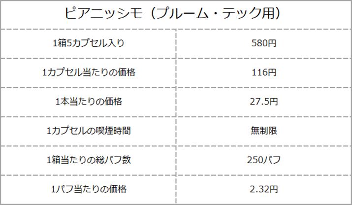 「プルーム・テック・プラス」と同じく、1箱に5カプセルが入っており、1カプセルにつき、約50パフ吸えるので、1パフ当たり2.32円。喫煙時間は無制限で、中断も再開も自由。喫味がとてもマイルドなので、軽いタバコとしての完成度は高いが、吸い応えがどうしても物足りなく、コスパがよいとは言いづらい。
