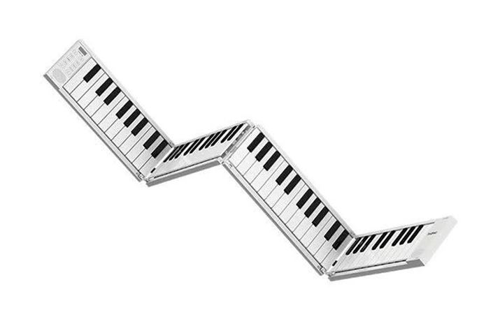 フルサイズのピアノと同じ88鍵盤を搭載するモデルですが、その大きな特徴は、強靱な樹脂と独自の折りたたみメカニズムを採用した接合部により、鍵盤をなめらかに折りたためること。本体にはスピーカーとバッテリーを内蔵し、屋外に持ち出して演奏できます。キーボードというよりは「折りたためる電子ピアノ」という位置づけの製品ですが、USB接続のMIDIキーボードとして使用できる機能性も備えているのがポイント。製品にはサスティンペダルも標準で付属しています。内部にはピアノやシンセサイザー、オルガン、バイオリン、サックス、オーケーストラなど128音色を搭載しており、さまざまなサウンドに切り替えて演奏を楽しめます。