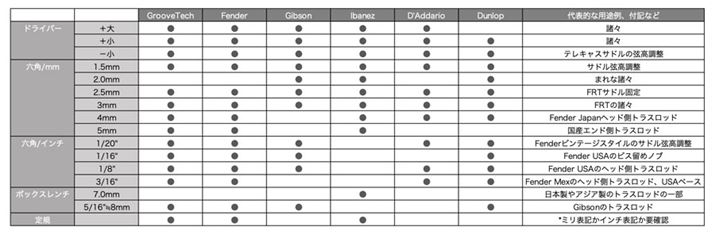 ギター本体メーカーのマルチツールは当然、自社製品に必要なサイズはひと通り揃えて搭載してあるようです。Fenderのマルチツールなんて、USA製、Mex製、Japan製のビンテージ仕様とコンテンポラリー仕様のギターとベース、おそらくそのほぼすべてに対応するサイズを網羅しています。いや、そもそも何国製でもネジやナットの規格は揃えておいてよ!と願いますが。