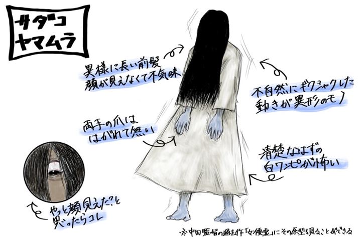貞子は、「白い服をまとった黒髪ロングの女性」という、日本の幽霊然としたシンプルイズベストなデザインで登場した。井戸にいる怨霊というあたりも、皿を数えるお菊さんで有名な「番町皿屋敷」を彷彿とさせる。