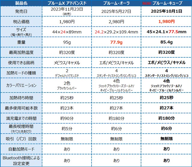 「プルームX アドバンスド」「プルーム・オーラ」「プルーム・キューブ」の3モデルスペック比較表。「プルーム・オーラ」は軽さとスリムさ、「プルーム・キューブ」は安さとコンパクトさが優位なポイント
