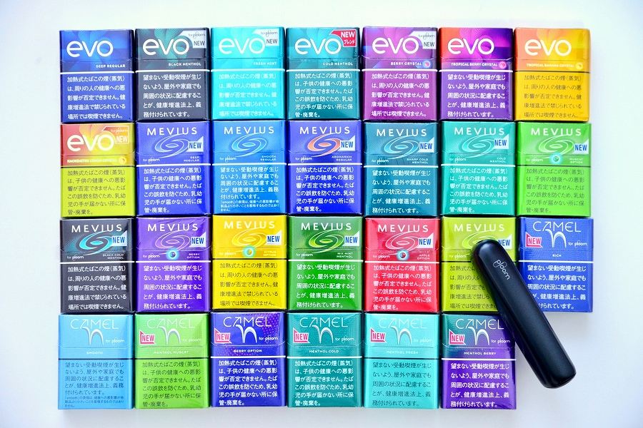 「プルーム・オーラ」の専用タバコスティックは、全27種類に。それぞれ20本入りで、「エボ」は各550円(税込)。「メビウス」は各520円(税込)、「キャメル」は各500円(税込)