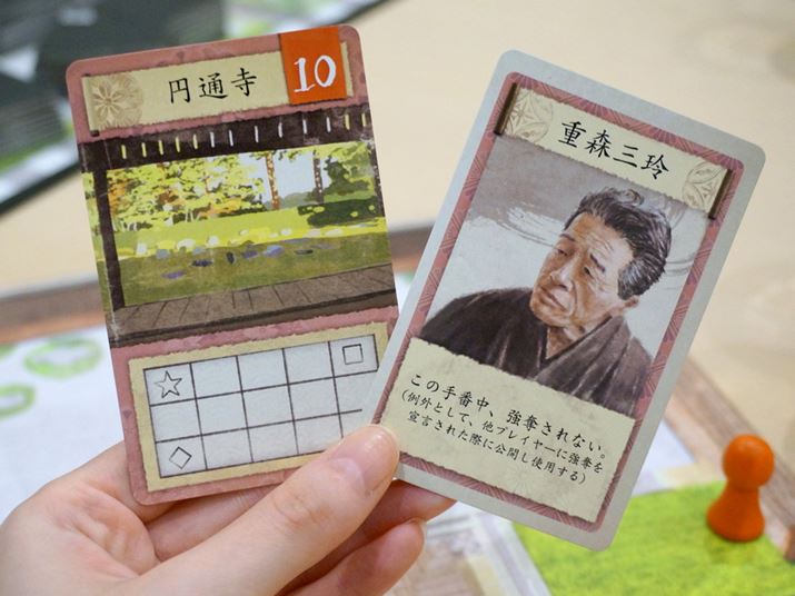 左が名庭園カードで、右が作庭家カード。名庭園カードには庭園の名称、石の置き方などが記されています。作庭家カードには、作庭家の名前、カードの持つ効力が書かれています