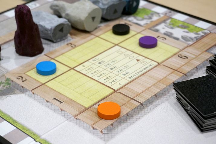 「石の獲得と設置」とは、貯めた徳ポイントを使って石を獲得し、その石を砂紋タイル上に置くことです。石は5種類用意されていて、プレイヤーの人数によって使う数が異なっています。獲得できるのは、徳ポイントが1以上で「横石」、2以上で「立石(小)」、3以上で「臥石」、4以上で「立石(大)」、5以上で「舟石」と決められているほか、どの石を選択しても徳ポイントは0になります。また、石を設置できるのは、禅僧駒が置かれているタイルか、その縦列にあるタイルのみ。禅僧駒がいるタイルに石を置いた場合、禅僧駒を1マス動かすことができます。なお、徳が6ポイントある場合は、任意の石を、禅僧駒の場所に関わらず任意のタイル上に設置できます。また、「舟石」は、プレイヤー人数よりも1つ少ない数しか用意されないため、1プレイヤーにつき1つしか置けません。
