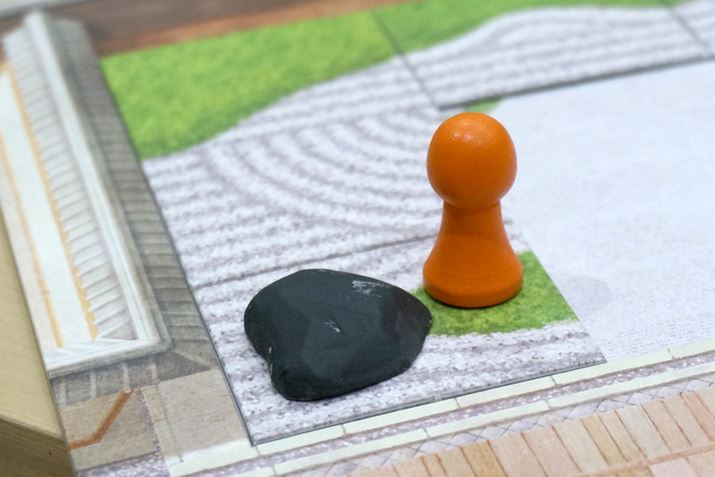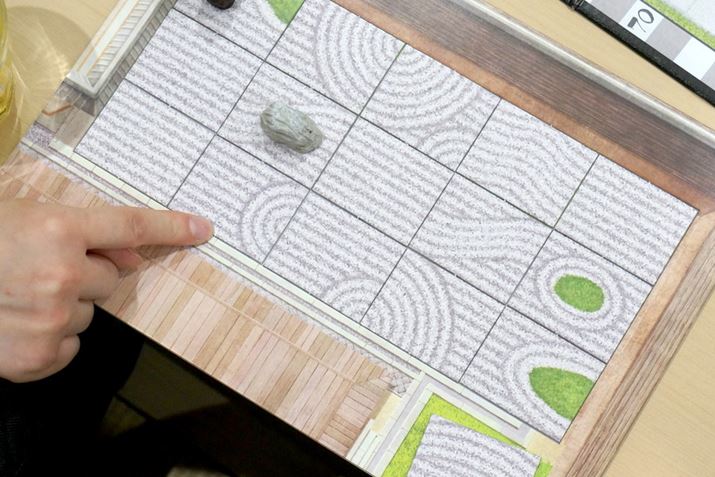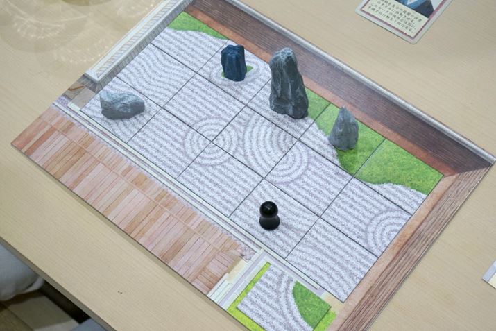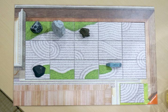 ゲームは、これらの行動を時計回りで順番に行い、進められます。いずれかのプレイヤーが、庭園ボードに15枚の砂紋タイルを配置して庭園が完成すると、その他のプレイヤーたちは、タイルの「廃棄」と「譲渡」ができなくなります。なお、15枚のタイルを配置し終えたプレイヤーたちは、「座禅」「禅僧駒の移動」「石の獲得と設置」「作庭家カードの使用」は行えます。すべてのプレイヤーの庭園に15枚のタイルが配置されたら、その手番の完了とともにゲームが終了となります。