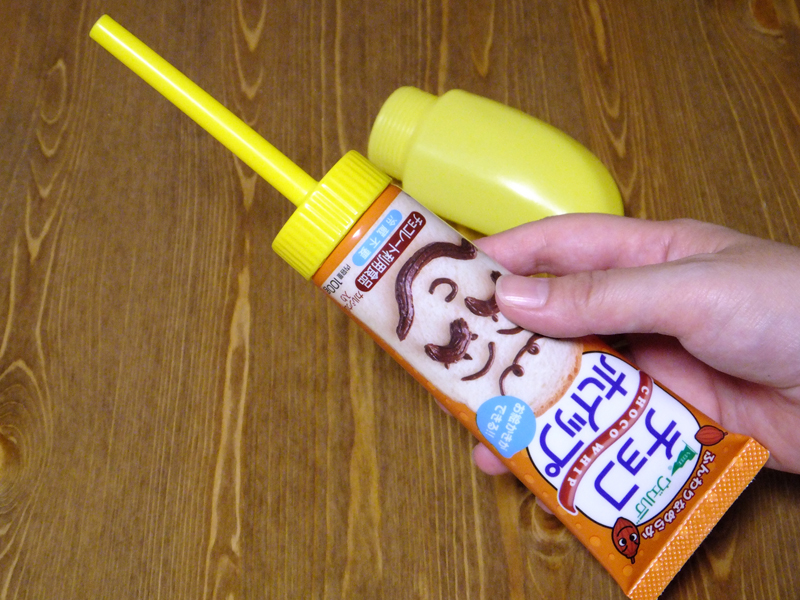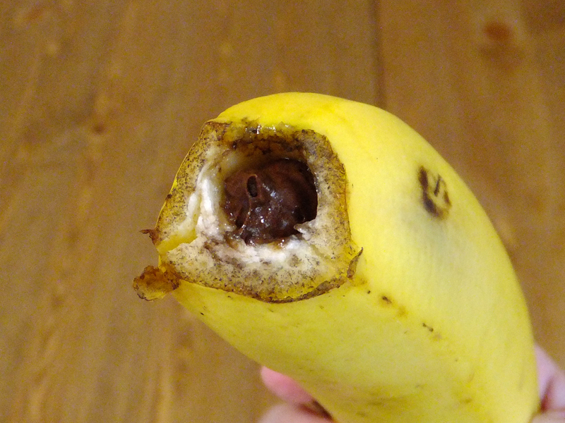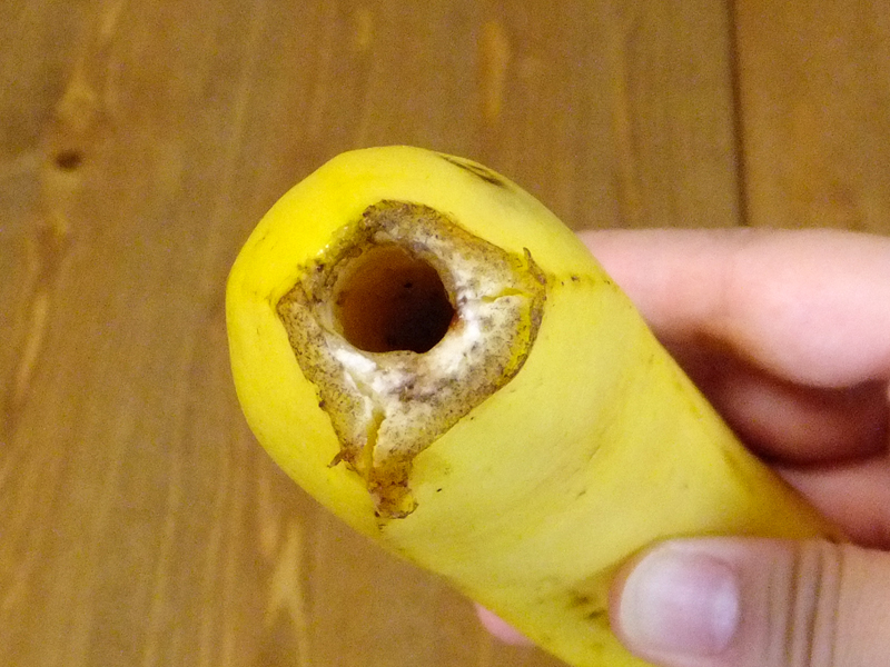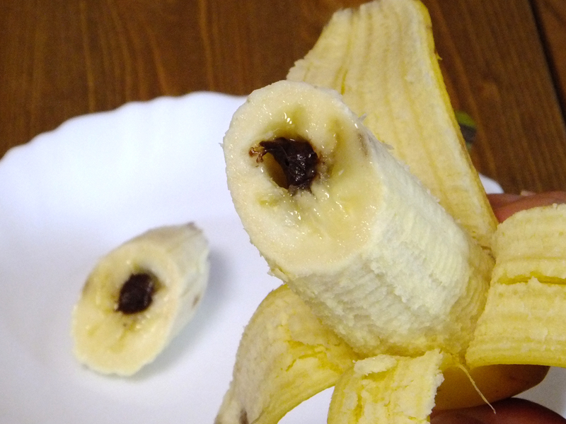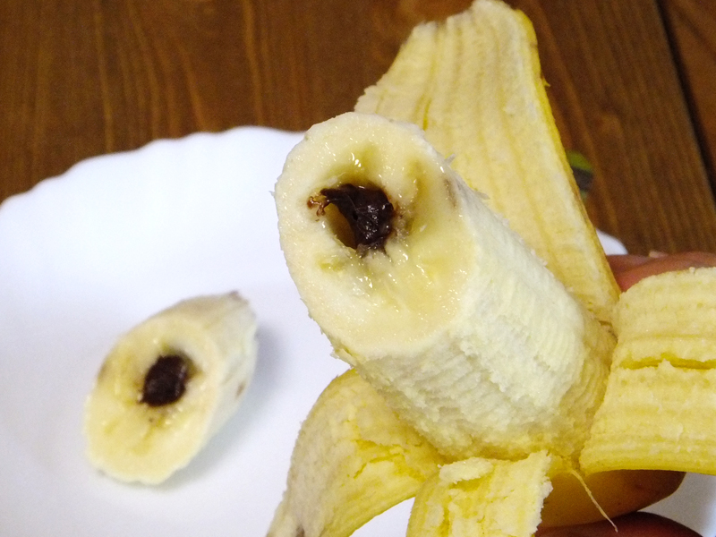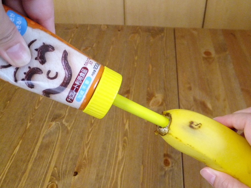 ホイップボトルのノズルを装着した「ヴェルデチョコホイップ」をバナナの穴に差し込み、チョコを注入します。うまい具合にチョコが入りました! 持ってでかける場合は、ラップでくるんでおけば、こぼれる心配もなさそうです