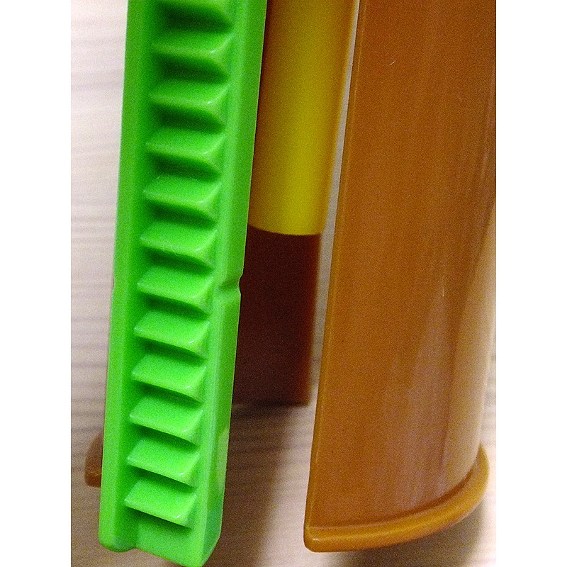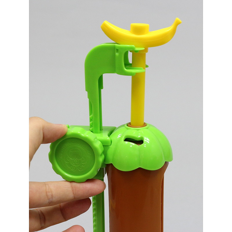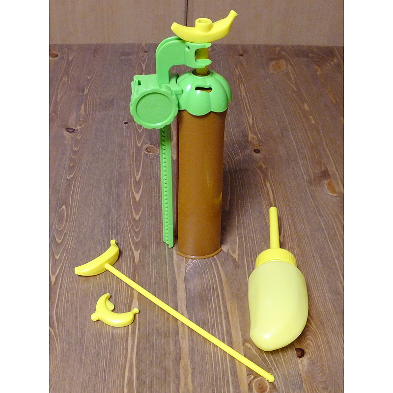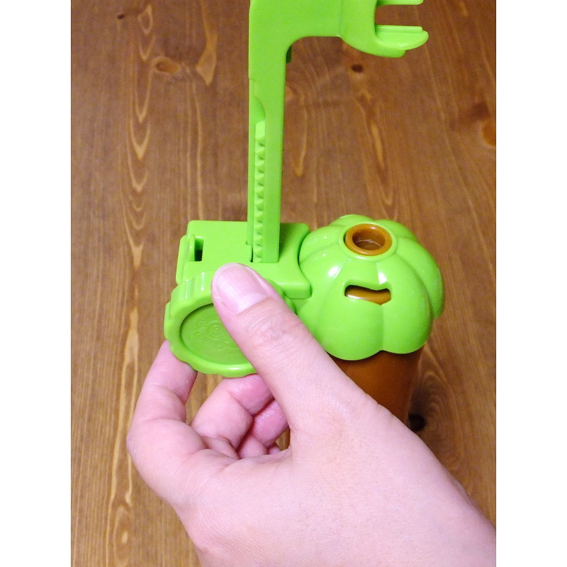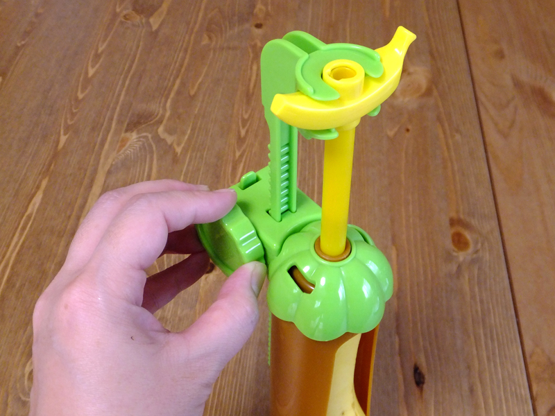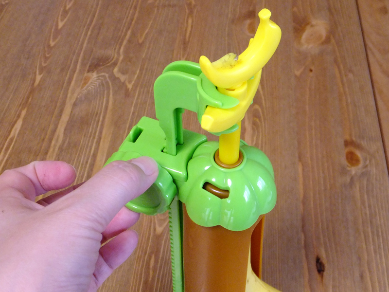 パイプがバナナに刺さったら、パイプ上部の穴にバナナカッターを差し込み、ダイヤルを逆に回しながらパイプを引き上げます。バナナカッターを差し込まないと、バナナに上手く穴が空きません。ちなみに、パイプがどこまでバナナに刺さっているかは、連動して動くパイプ送りギア側面にある凹み部分で確認することができます。バナナのカーブと凹みが並んだら、ダイヤルを回すのを止めましょう