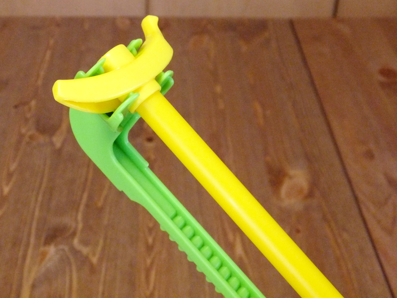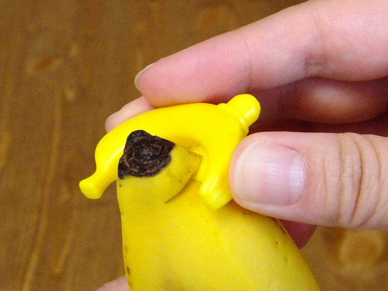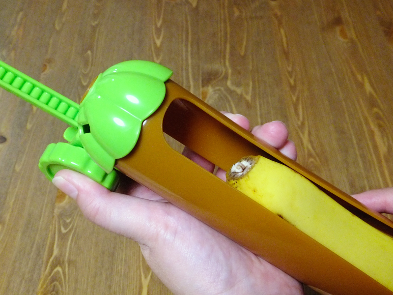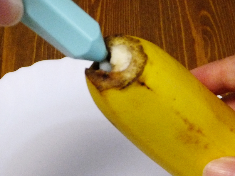 まず、バナナの先端にバナナカッターを差し込み、クルクル回して切り落とします。バナナカッターは、刃の部分もプラスチックでできているので、子供にも安心(対象年齢は、3歳以上)