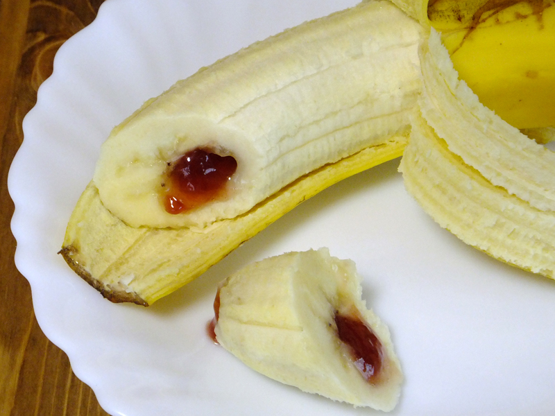 付属のホイップボトルにストロベリージャムを入れ、穴を空けたバナナに注入。うまくバナナの中にジャムが入っていました! ただ、横にすると中身がトロトロこぼれてきてしまいます。そのままかぶりつくか、凍らせてからスライスし、ヨーグルトなどに入れて食べたほうがよさそう。または、硬めのジャムを選べばこぼれないかもしれません