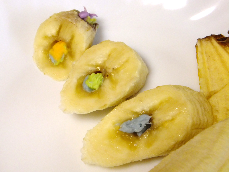 中身が溶けたら、ペン先を切って注入。すぐ固まってしまうので、スピードが重要です。おおよそ想像どおりのカラフルチョコバナ〜ナができました。これはもちろん、切って食べるのがおすすめ!