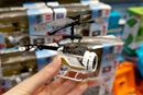 CCPの「ナノファルコンデジカム」。カメラを搭載した、全長13cmのマイクロヘリコプターです。連続飛行時間は約4分間、操作可能距離は約15m