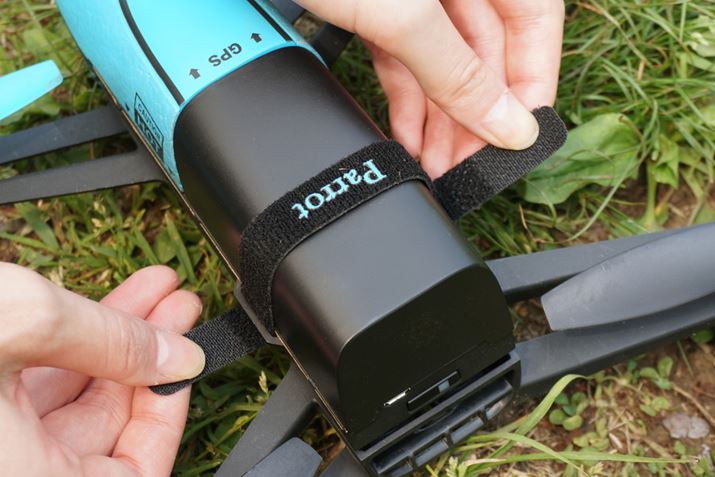 バッテリーは、取り外しが可能な着脱式です。装着した後は、外れないようにバンドでしっかりとめます。バッテリー1本あたりの駆動時間は約11分です