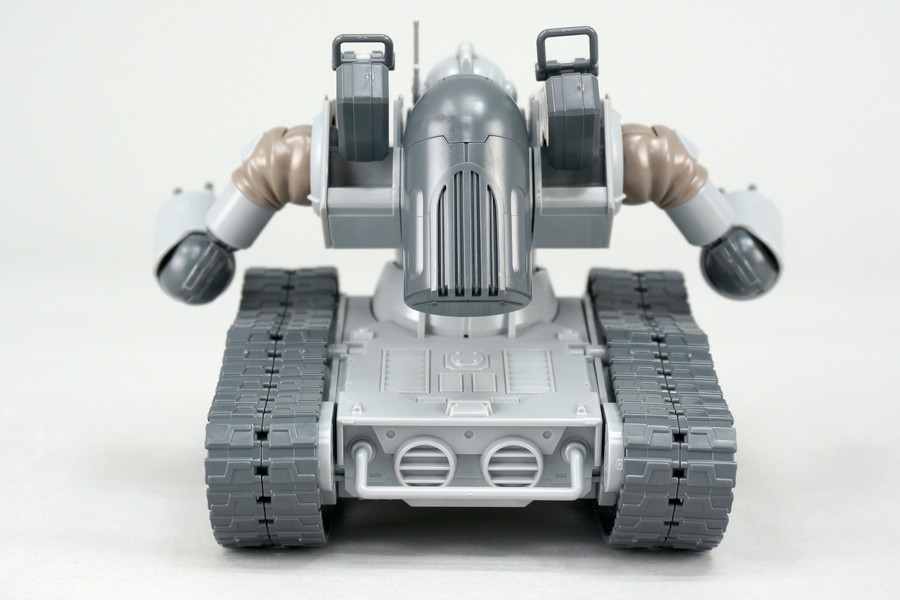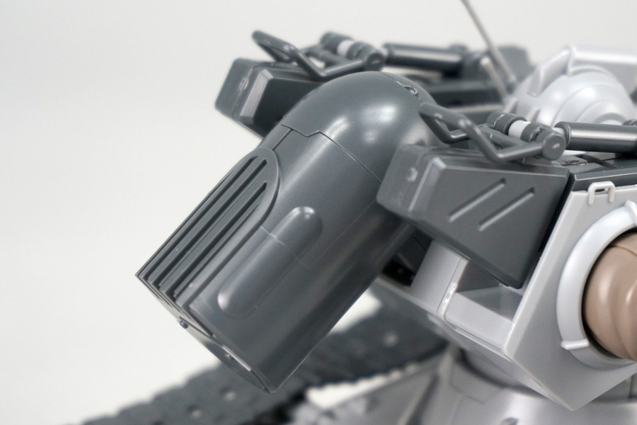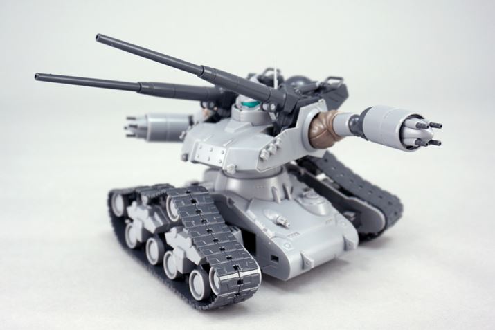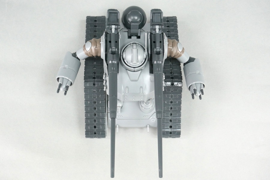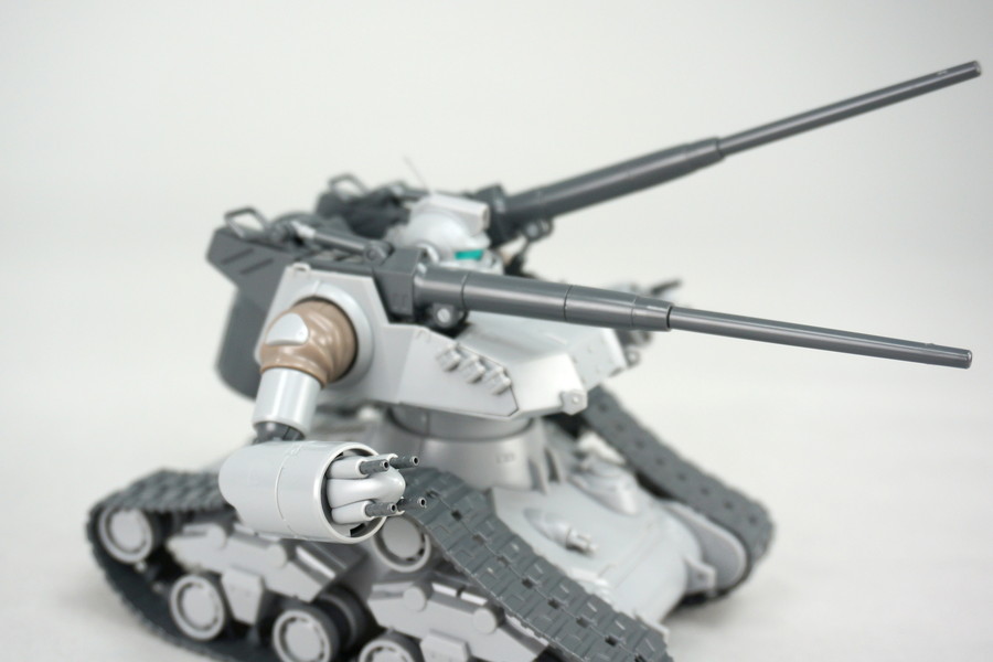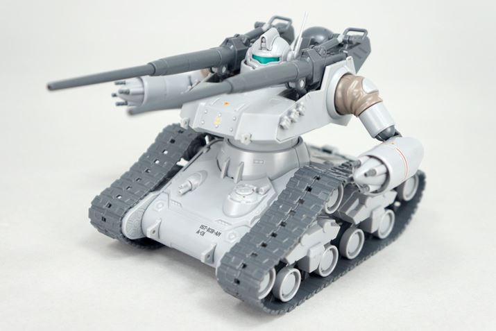 これが、HG 1/144 ガンタンク初期型です。いわゆるガンタンクと比べると、グレーを基調としたカラーリングで、戦車っぽさがありますよね。くるっと腰をひねることができるほか、キャタピラー部(履帯ユニット)は、ユニットとして動かすことができます