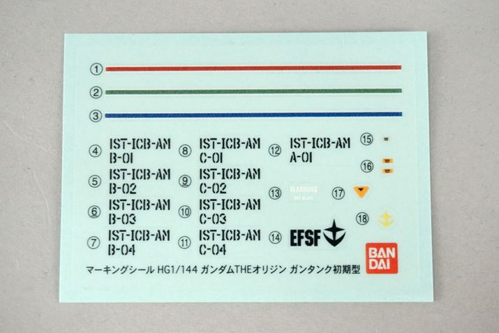 ガンタンク初期型を組み立てて、すべてのマーキングシールを貼ってみました。A小隊用のマーキングシールを貼ったので、腕のラインは赤色です