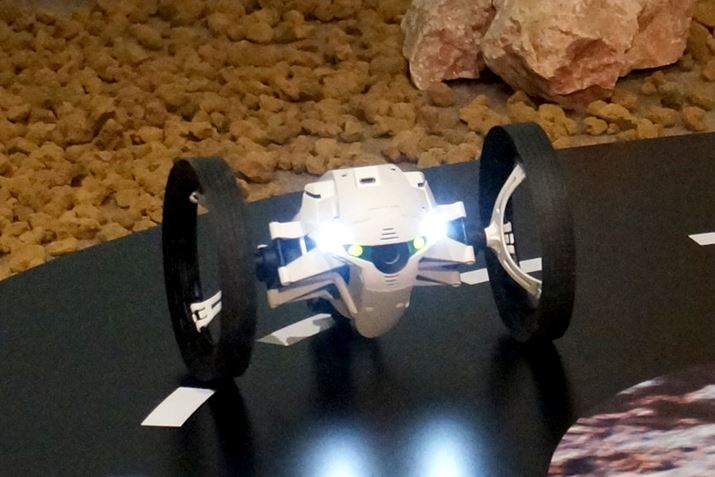 陸上を走行する「Jumping」シリーズには、「Jumping Night」と「Jumping Race」の2機種が登場。いずれも、回転や突進、ジグザグ走行、高速の90度ターンのほか、最大80cmの高さと距離をジャンプすることができるミニドローンです。また、広角カメラを搭載していて、走行中の様子はタブレットやスマートフォンにライブストリーミングされます。さらに、マイクとスピーカーを備えているのも特徴で、音声の録音ができるほか、ドローンの前にいる人と通話することも可能。稼働時間は20分。Jumping Nightは、明るさを調整できる高出力LEDを2つ搭載した暗視対応モデルで、価格は25,800円(税別)。Jumping Raceは、時速13キロの高速走行が可能なレース用ロボットで、価格は26,800円(税別)。