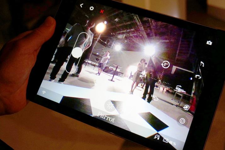 操縦しているアプリの画面。走行中のカメラからの映像は、操作しているタブレットにライブストリーミングされ、ほぼリアルタイムで走行中の映像を見ることができます。右上のカメラボタンで、静止画を撮影することも可能。撮影した写真や動画は、4GBの内蔵メモリーに直接保存されます。暗い場所で操縦している画面ですが、思っ以上に映像は明るく見えていました