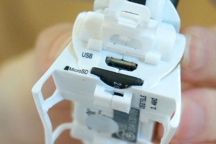 付属のUSBケーブルに本体を接続してヘリ本体を充電します。充電中は緑色のランプが光ります。充電時間は、約35分。機体にmicroSDカードが入れられるようになっていて、動画や写真を保存できるようになっています。microSDカードは、容量32GBまで対応。付属のUSBケーブルをつかって動画や写真をPCに取り込めます