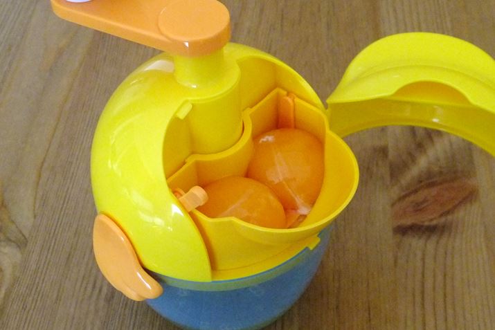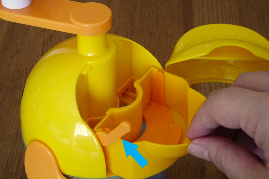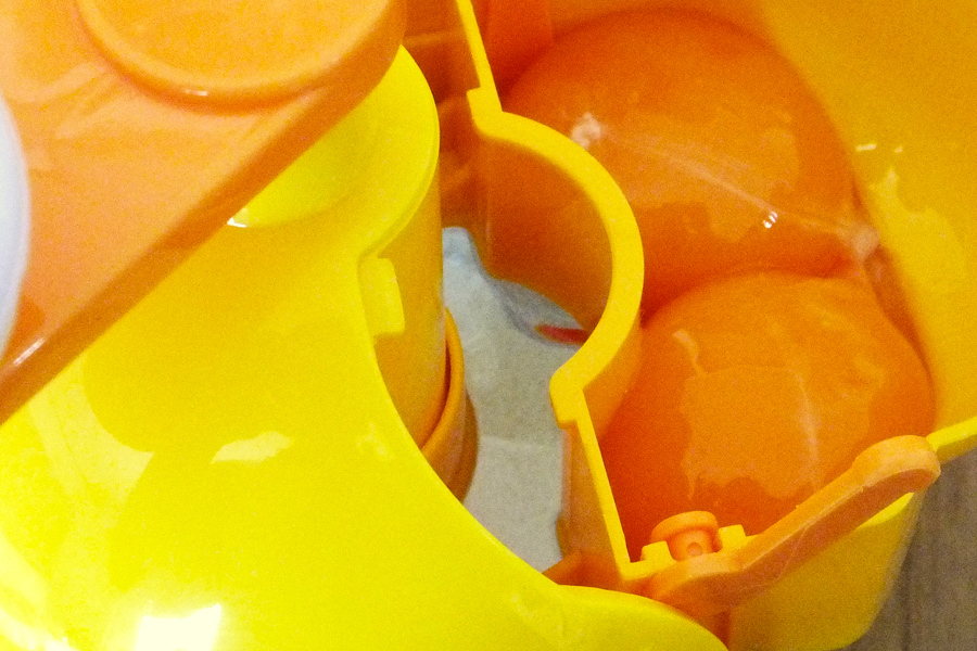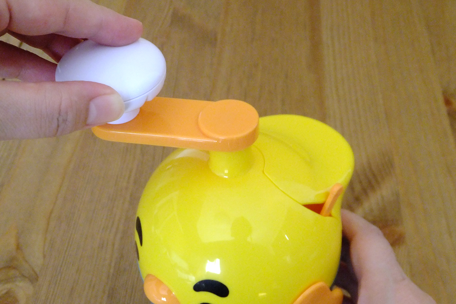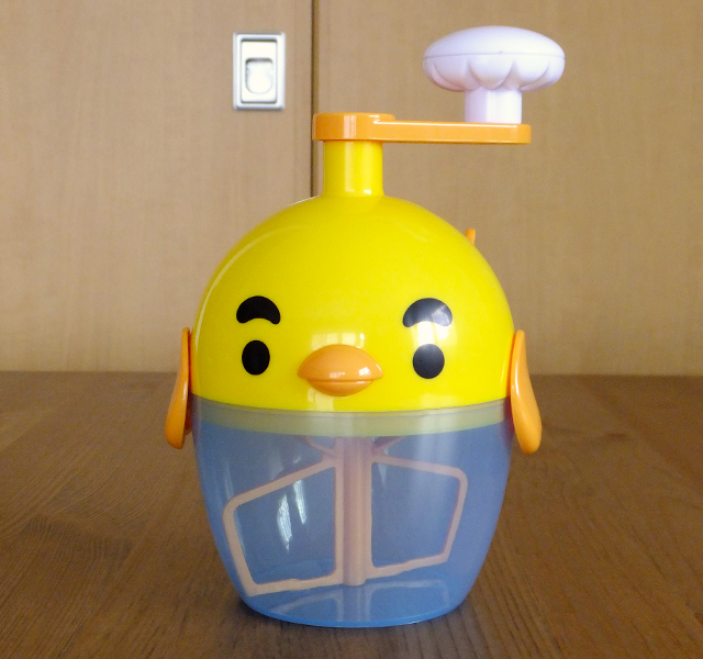 「ふわしゅわびっくり!レッツ!オムレッツ」は、かわいいヒヨコ形をしています。生卵を入れると、卵白だけが隙間から下の胴体部分(ボウル)に落ちる構造。ボウルに卵白だけが入った状態で頭に付いているハンドルを回すと、中にある羽が回転して卵白をメレンゲ状に泡立てます。