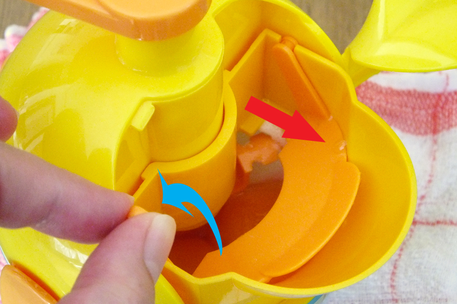 「きみスイッチ」を青い矢印の方向に倒すと、卵投入口の底面が赤い矢印の方向にスライドして黄身がボウルに落下