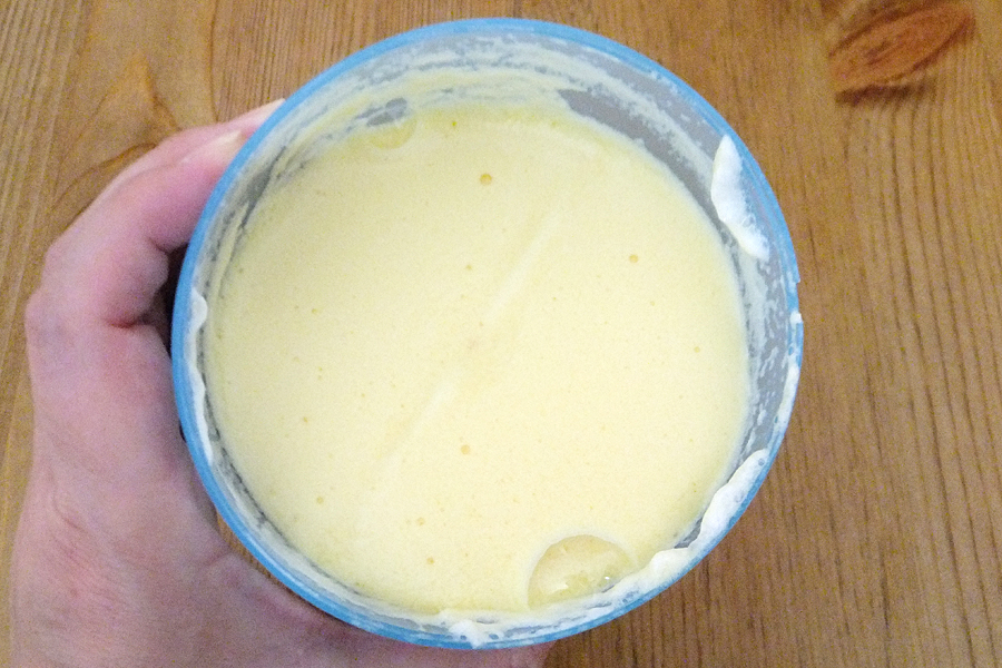 泡立てた卵白に卵黄を落とし、さらにハンドルを30〜60秒程度回して卵白と卵黄を混ぜ合わせたら生地の完成です。