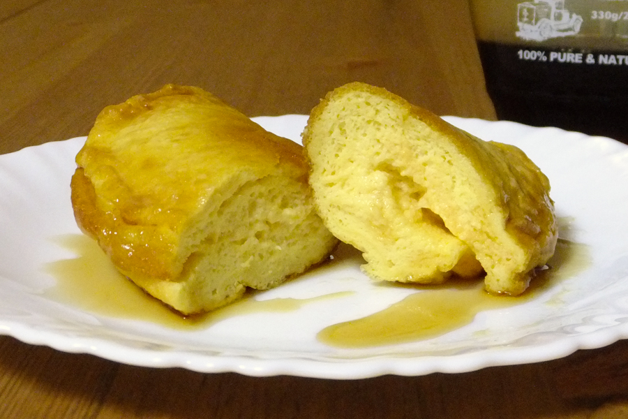 バターの香りと見た目が完全にスイーツなのでメープルシロップをかけてみたところ、これがバツグンに美味! バターの香り、“ふわっふわ”の見た目、そして食感がぴったりマッチします。