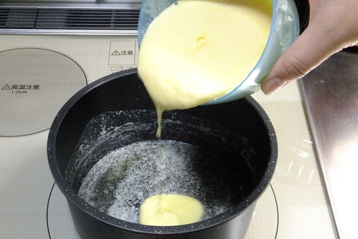 オムレツを焼いてみましょう。弱火で熱したフライパンにバター溶かし、そこへ生地を流し入れます。