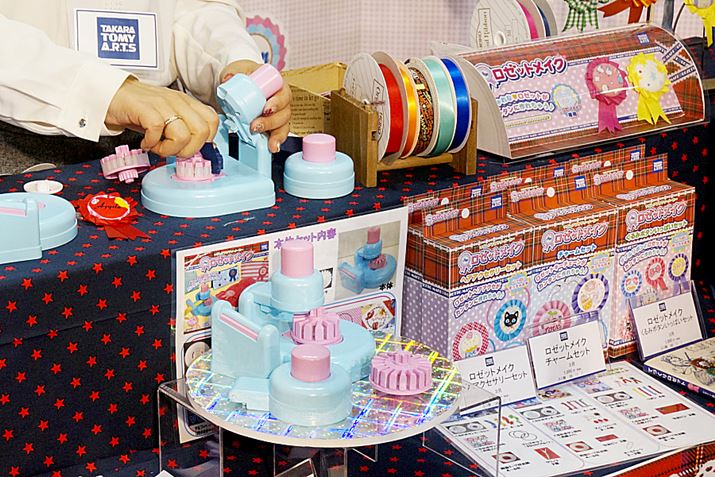 AKB48やジャニーズの衣装に可愛いロゼットが付いているのを見かけたことは無いだろうか? このロゼットとは、リボンで作った勲章のようなブローチで、作り方が紹介された本が出版されるほど今ブームが来ているのだ。最近では、街中で女子高生がカバンに付けている姿を見かけることも。そんな人気のロゼットを実際に手作りしようとすると、リボンを細かく畳み込んで作る必要があり、手先が器用な人でも完成までには1時間ほどかかる(らしい)。それが簡単に作れてしまう玩具が「ロゼットメイク」。2016年3月に3,800円(税別)で発売される予定だ。動画を見るとわかるように、本体にリボンをセットして繰り返しパーツを回転させながらボタンを押していくだけで、リボン部分がアッという間にできあがる。あとは、くるみボタンを取り付けるだけで完成。制作時間はわずか2分程度。こんな可愛いロゼットがこんなに簡単にできてしまう。入学・卒業の時やウェディングパーティーでも重宝しそうだぞ。