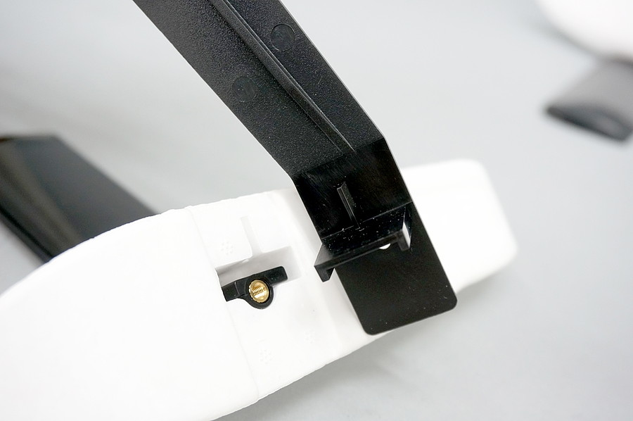 次に2つのサイドフロート(白い発泡スチロール)と2つのサイドフォイル(黒いへらみたいなもの)をそれぞれアームの左右の先端に取り付けます。T字のリアセンターボードもねじ1つを使って取り付けます