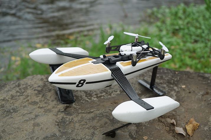 ミニドローンのHydrofoil Drone。4枚のプロペラを持つミニドローンを、付属の船体に装着することで水上走行が行なえます。価格は21,800円(税抜)です